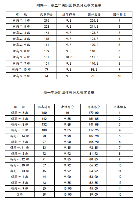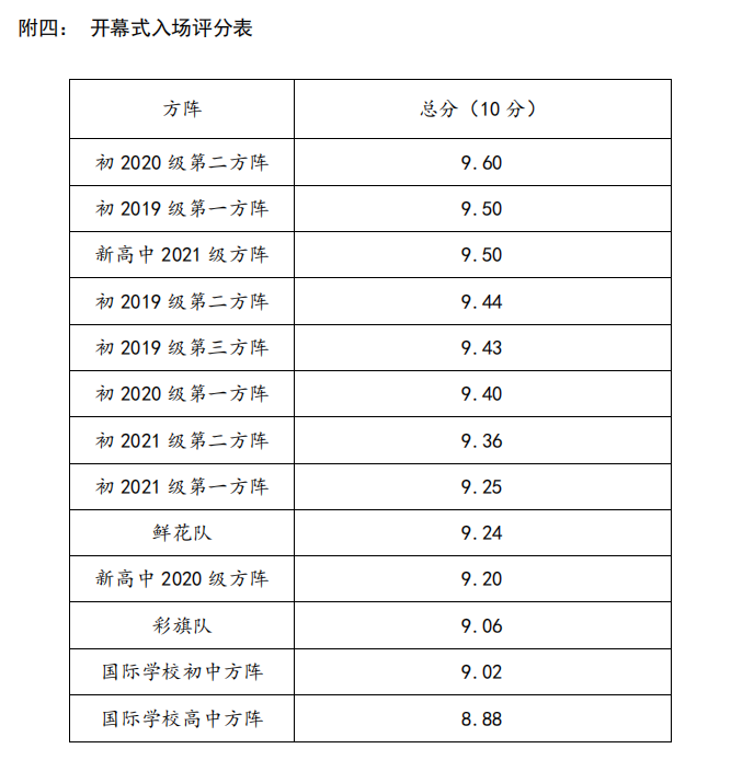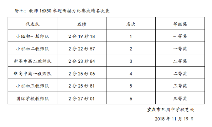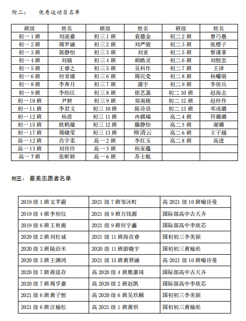 (附一:团体总分及获奖名单; 附二:优秀运动员名单; 附三:最美志愿者名单;附四:开幕式入场方阵评分表;附五:优秀裁判员名单;附六:体育道德风尚奖名单;附七:教师16x50米迎面接力比赛成绩名次表)
