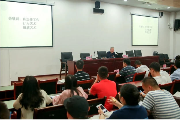 在70分钟的专题培训中,解老师以《班主任工作的艺术》的为题,围绕班主任工作的行为艺术、情感艺术,及班主任工作的注意事项三个方面层层解析,娓娓道来。