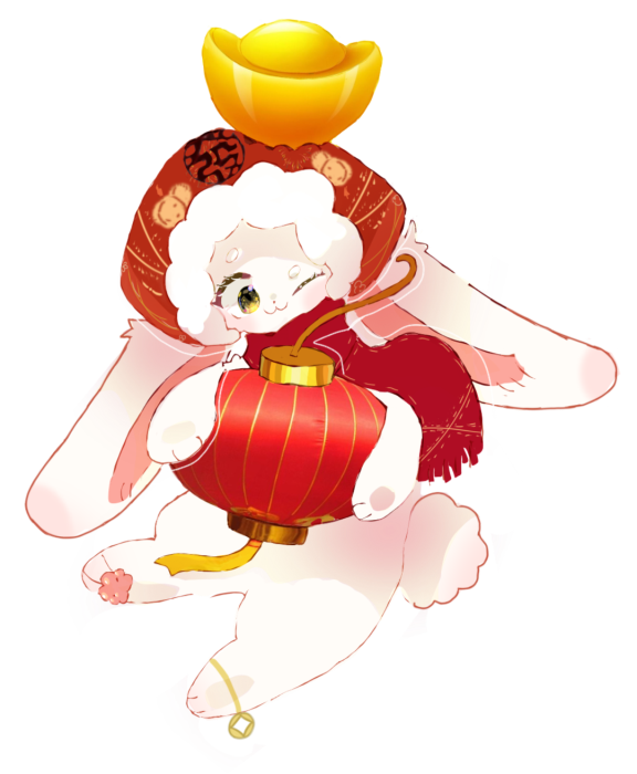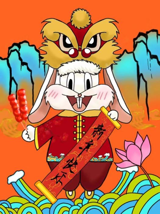 初2023届鹏1班唐诗棋同学的兔子形象就有很多自己的独特审美,甚至给人一种滑稽搞怪的感觉,尽管也是头戴醒狮帽,身着对襟衣,手拿春联,但兔子的形象却和传统的中国审美有些不合拍,在和指导老师沟通后,最终呈现的是一只更加拟人化的、快乐调皮的小白兔形象,强化Q版的造型看起来更加呆萌可爱。由它装点的福贴和红包一经面世,便受到老师和同学们的热烈追捧,可见大家更喜爱兔子可可爱爱的固有形象。