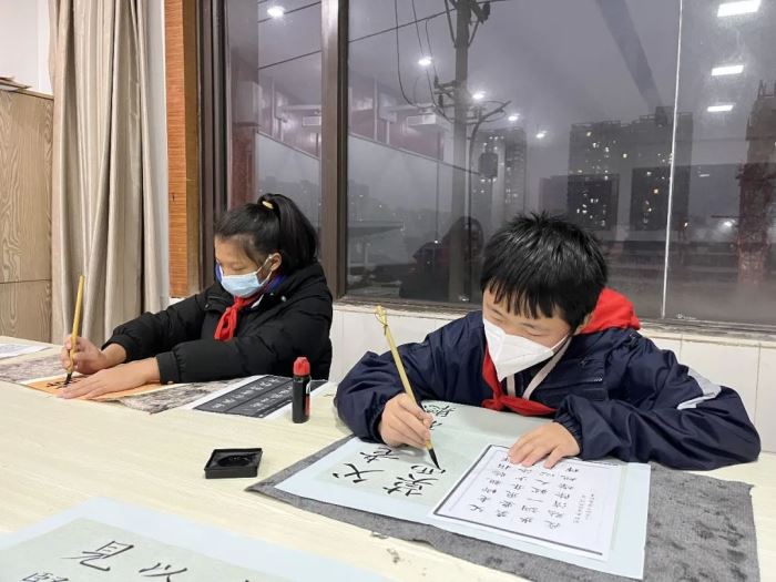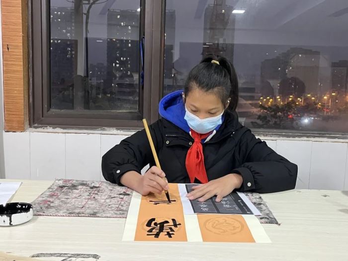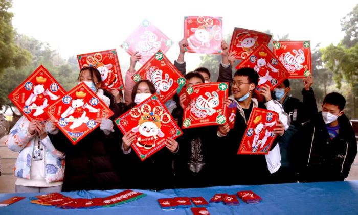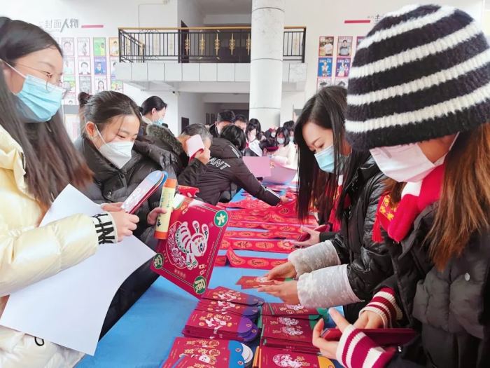 展览前一周,在美术学科组的组织下,喜欢书法的老师和同学们积极参与进来,利用课余时间书写了300余副春联和福字,以及学生设计的600多份定制福贴和2000多个红包赠送给老师和同学们。还有一支送福小分队,送到身在门岗值班的保安,送到服务教学的部门和年级,将一份份暖心祝福送给辛勤工作中的巴川人。
