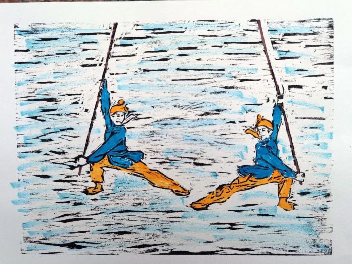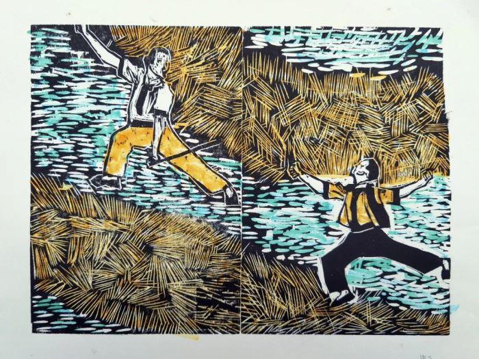 每组6位同学,每名组员完成作品中的一部分,手绘能力强的同学做初稿上版,大家一起商讨刻制方法,根据分工刻制自己负责的部分,刻完后再印制、着色,老师会带领同学们到展览现场评价总结。
