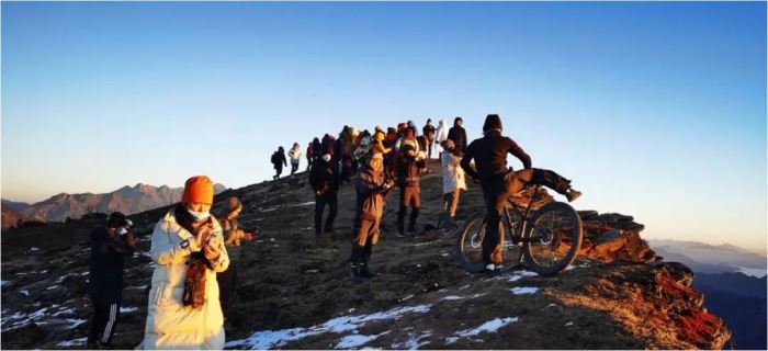 在凌晨五六点钟爬上山顶,在海拔4000多米的地方寻找日出的方向