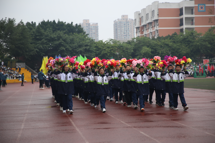 鲜花方阵以矫健的身姿、整齐的步伐走向主席台。笑靥如花,自信如花,花团锦簇,洋溢着巴川学子的活力。