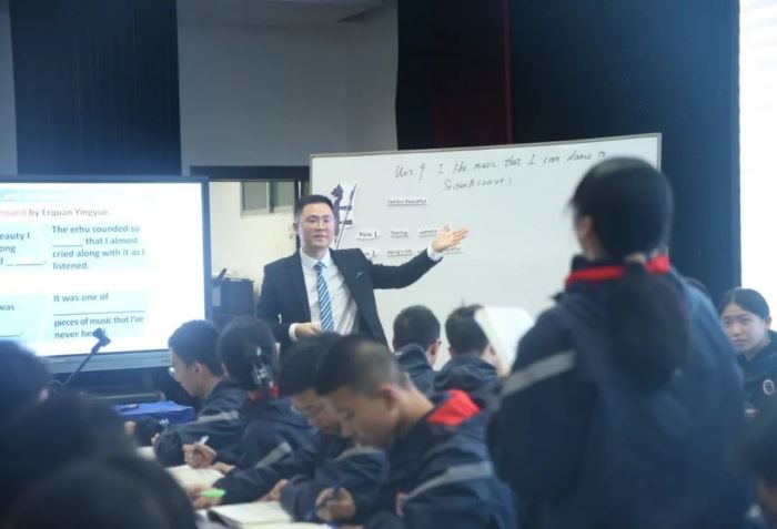 在初中英语学科的课堂上,况文俊老师正引导同学们从阿炳与《二泉映月》的故事中,去学习新的单词与阅读技能。“Every student write about one aspect and then read the award words one by one.”在课程的末段,他让同学们从课程中学到的知识入手,为民间音乐家阿炳写一段颁奖词,通过著名人物的故事激发大家对英语语言表达的兴趣,同时也更好地提升了学生的文学素养和人文素养。