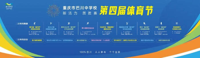“强健体魄”,巴川学子四大核心能力之首。体育节,核心能力的集中展现。让每一个孩子能参与、有成长,是本届体育节的初心。于是,我们推出了包含足球、篮球、乒乓球、羽毛球、课间操、田径运动会等9项赛事,以及会徽设计展、个人挑战赛、亲子越野跑等与运动会相关的周边活动7项,极大地丰富了运动会的内涵与外延。