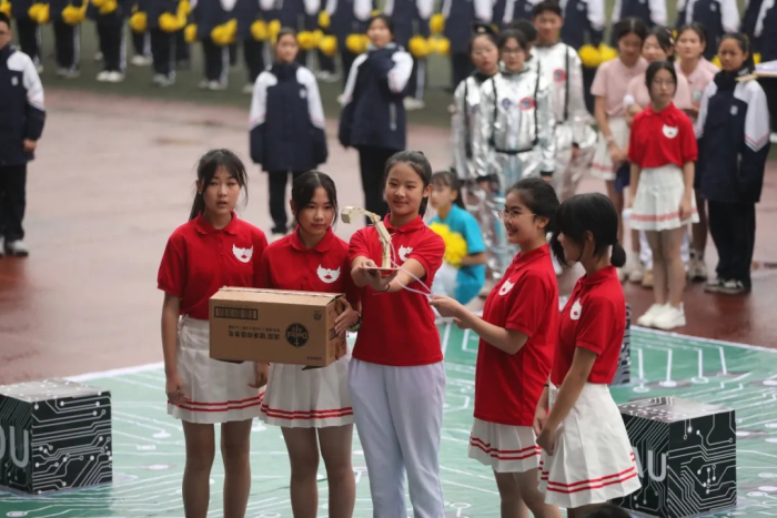 STEAM创新教育学部既是科学的探索者,也是艺术的创造者。他们以“如何通过创新学子和道具的配合,演绎出STEAM 5G速度、STEAM创新教育学部5大能力和STEAM号火箭腾飞的运动会开幕式效果”为核心驱动问题,巧妙地组织了一场以“5G加速,创新腾飞”为主题的项目式运动会开幕式表演。
