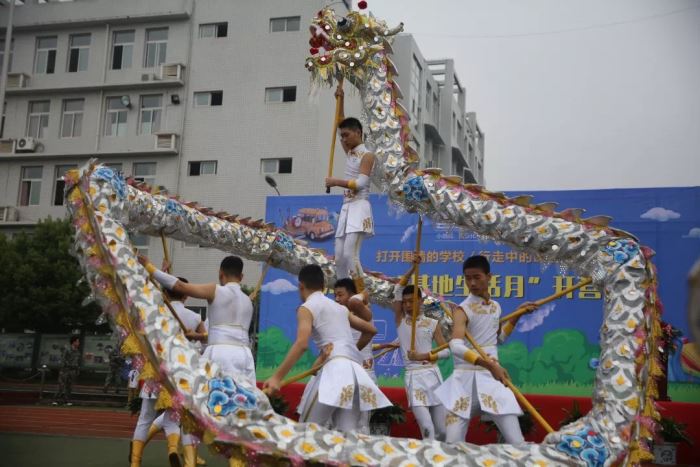“开营仪式”上,铜梁校区的学长学姐们带来了“绝活”——舞龙表演,七年级新生的军训生活也正式拉开序幕。