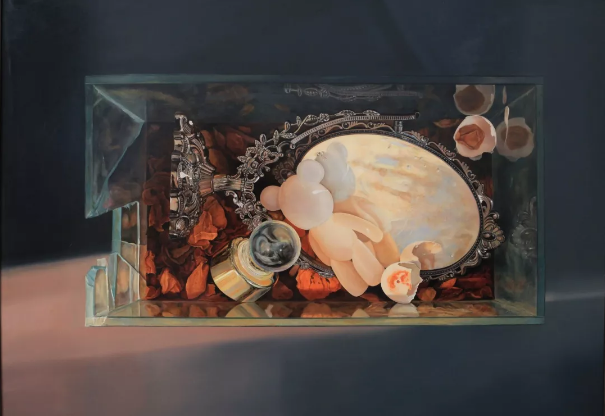 最近启禹作品中也能看到一种叙事性或象征性。如作品中,鱼、针管、药用玻璃瓶等形象似乎带有一种指代关系,他无疑想进行更为深层的言说。作品有意通过一种他所喜爱的肌理效果来营造视觉上的真实,有时这种真实甚至显得相当“冷”,让人不寒而栗。