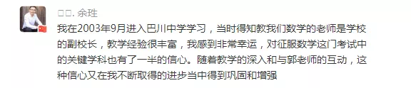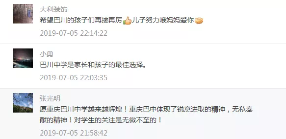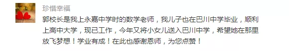 小编有话说:在后台看到这几条留言时,甚是感慨。父母和子女都受益于同一位老师,就读于同一所学校,名副其实的巴川“学二代”。而这更是力证巴川的魅力和实力。相信未来,会有更多孩子在巴川成长,成为学二代,学三代,学N代……