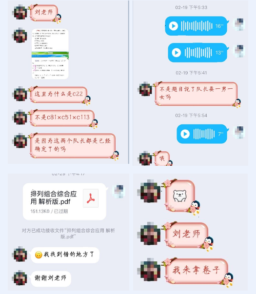 私下里,刘老师还和同学们打成一片,时常在QQ群里进行课业交流。QQ群成为了同学们自主学习时,挖掘“宝箱”的入口,名校卷、高校卷、视频资料,刘老师那儿全都有,每当同学们无法打开“宝箱”时,刘老师便通过语音给学生一一解答,当学生理解后,再将试卷解析发送给学生们,进而印证其思路。