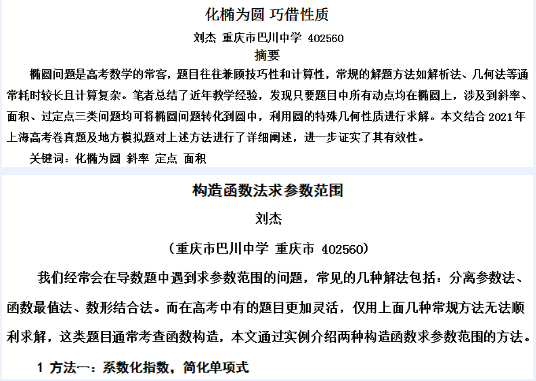 教学的成果,不仅在学生的成绩上得以体现,同样还在研学上获得了认可,由于对张锦航、郭峻宇两位同学的教学过程极为典型,也有教学经验意义,刘杰老师在闲暇时写出了《化椭为圆,巧借性质》、《构造函数法求参数范围》两篇教育论文,目前《构造函数法求参数范围》已被北京师范大学数学系主办的《中学生数学》收录,将于2021年12月发表。