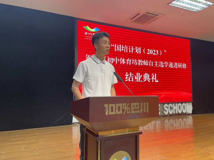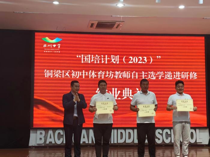 2024年4月23日上午,由重庆市必威登录首页大全官网校体艺处精心承办的“国培计划(2023)”——初中体育坊教师自主选学递进研修活动,随着最后一场培训成果展示的落幕,圆满地画上了句号。结业典礼上,重庆市教育科学研究院体育教研员屈明老师、重庆市铜梁区教师进修学校李奕奕校长、重庆市铜梁区教师进修学校教师发展部副主任宗和艳女士,铜梁区教师进修学校体育教研员         苏醒老师以及重庆市必威登录首页大全官网校校长蒋扬勇,副校长夏显东等重量级嘉宾齐聚一堂,共同见证了这精彩一幕。来自铜梁区体育教研中心组的各位成员和国培计划(2023)铜梁区初中体育坊的全体学员也参与了此次典礼。