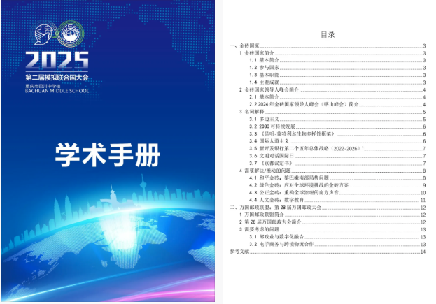 当聚光灯亮起,身着正装的“各国代表”用流利的英文阐述立场、发起动议时,很难想象这是一群平均年龄14岁的初二学生。他们手中的《学术手册》,一本经过权威系统查重、引用含IPCC气候变化报告、联合国教科文组织数字教育文件等13份权威文献的30页指南,成为这场高规格会议的核心工具。议题包含“第16届金砖国家领导人峰会”与“第28届万国邮政大会”,讨论内容涉及“和平金砖体系”“绿色能源转型”“邮政业数字化”等专业领域。