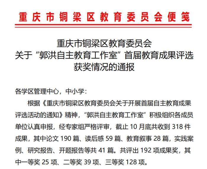 重庆市铜梁区教育委员会 关于“郭洪自主教育工作室”首届教育成果评选 获奖情况的通报
